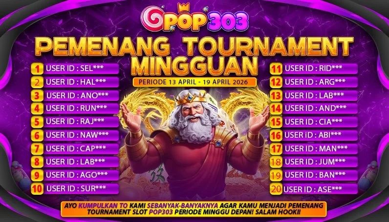 Selamat Kepada para member POP303 yang telah berhasil memenangkan hadiah Mini Tournament Slot Mingguan Periode 13 - 19 APRIL 2026.